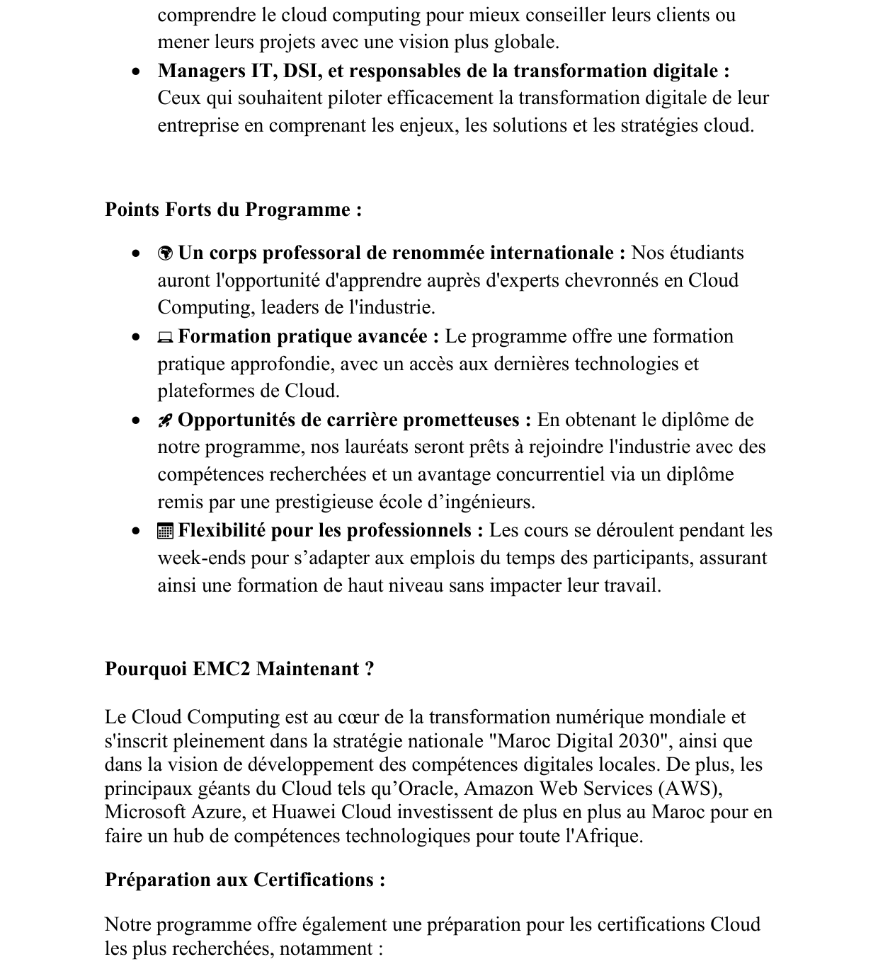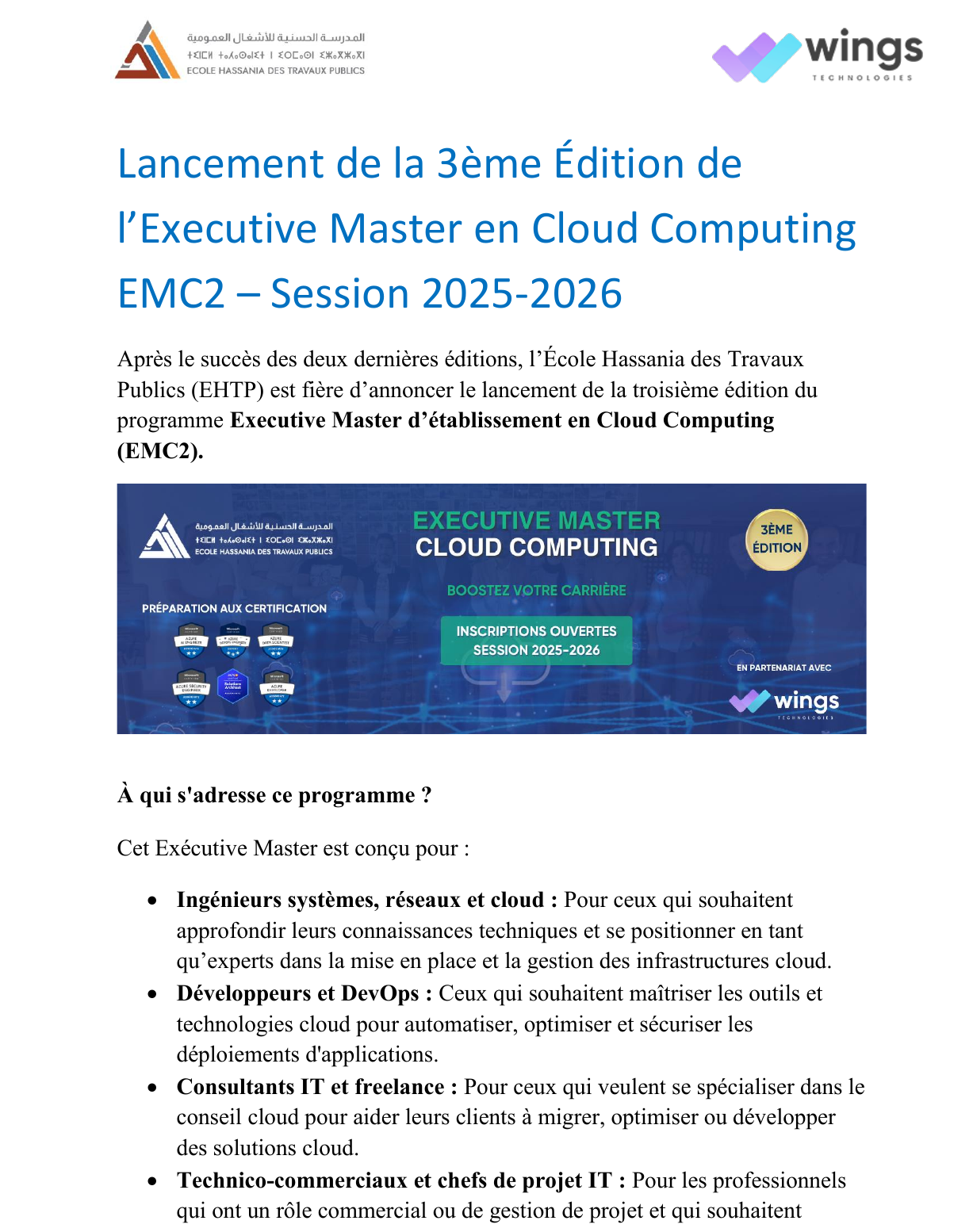 Lancement des inscriptions pour la 3ème édition de l’Executive Master en Cloud Computing Télécharger la brochure. Lien d’inscription Calendrier d’inscription des élèves ingénieurs de 1A 2025/2026 Related Posts Calendrier d’inscription des élèves ingénieurs de 1A 2025/2026 24 septembre 2025 676 views Calendrier d’inscription des élèves ingénieurs de 3A et 2A 2025/2026 16 septembre 2025 1 081 views Notes d’information aux élèves ingénieurs de l’EHTP relatives à la rentrée académique 2025-2026 3 septembre 2025 4 664 views Concours d’accès en première année du cycle ingénieur de l’EHTP, Edition 2025 – Liste des candidats admis et Liste d’attente 30 juillet 2025 4 978 views Lancement des inscriptions pour la 2ème édition de l’Executive Master en Ingénierie et Management QHSSE 18 juin 2025 1 164 views